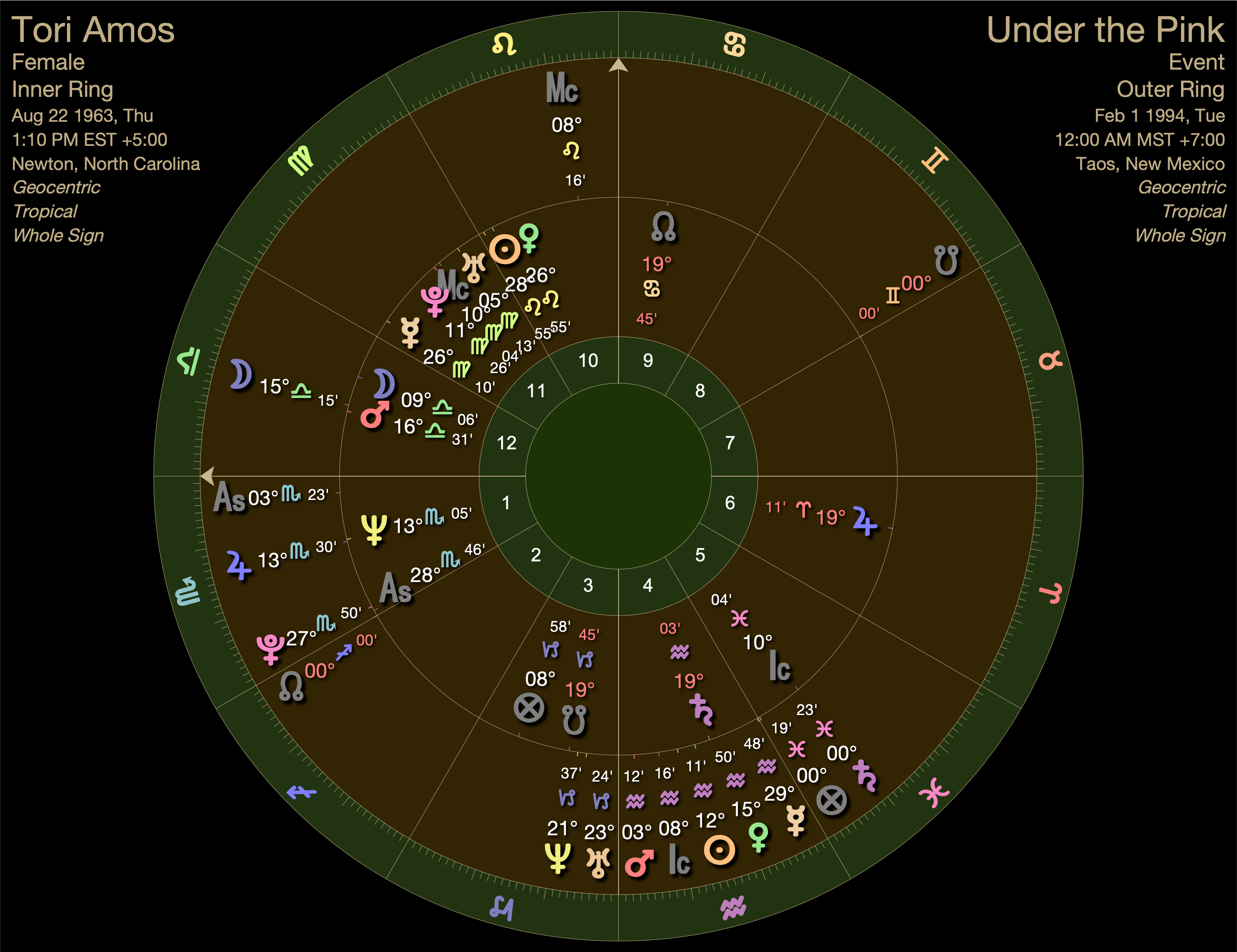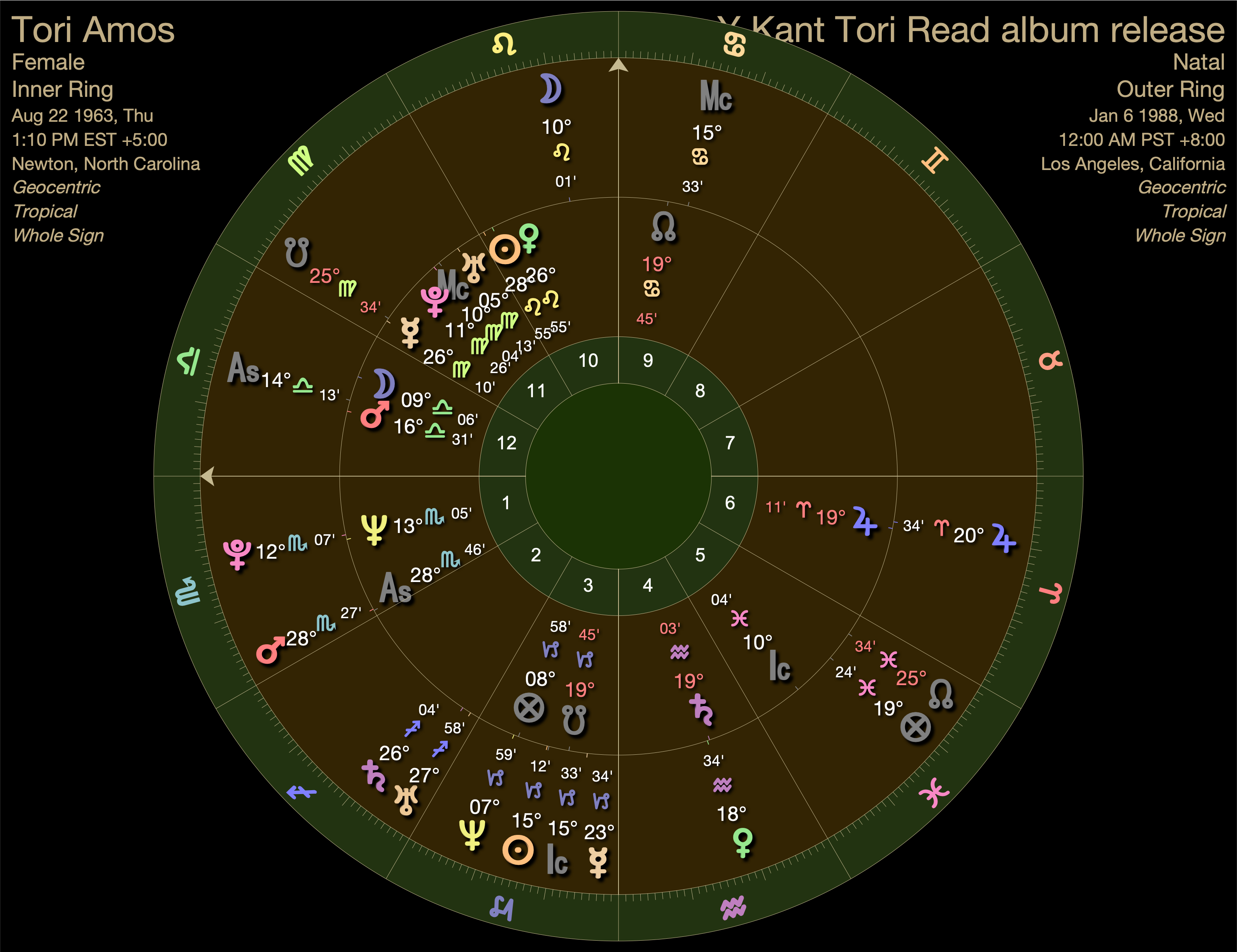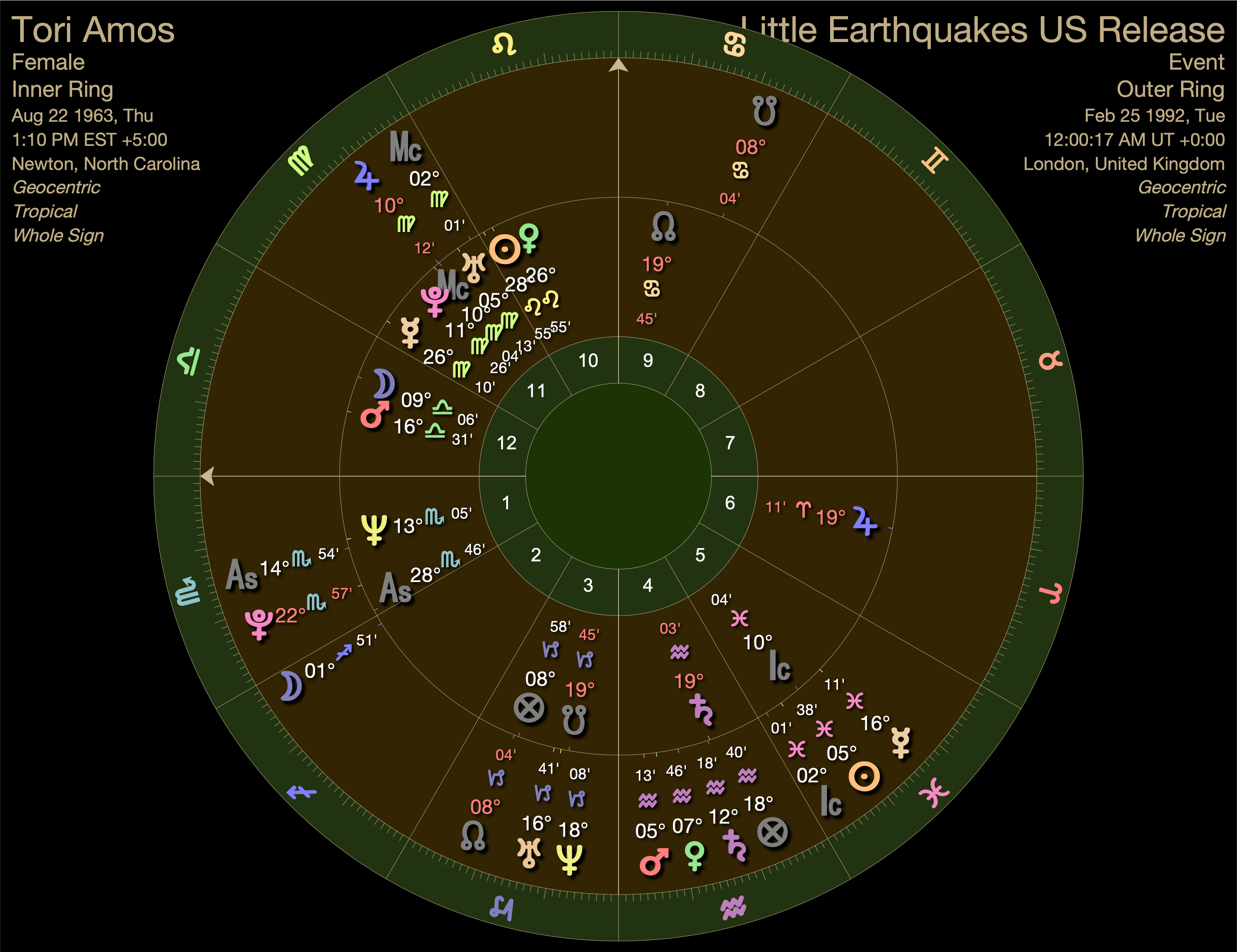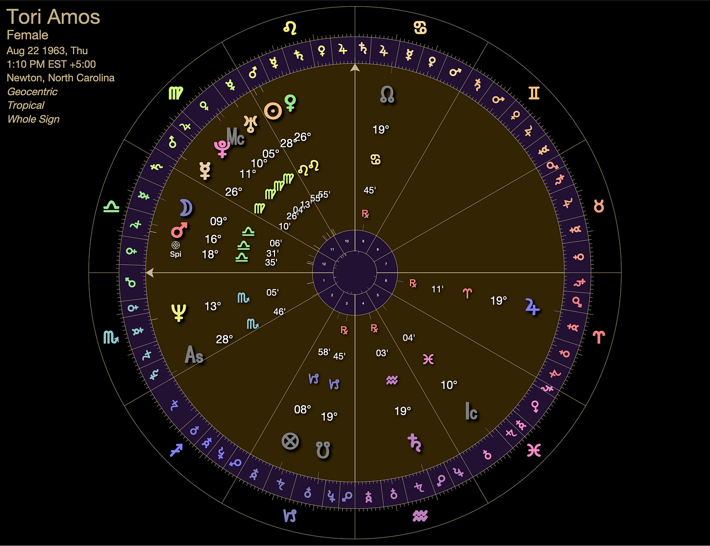 Pluto, on it’s way out of Tori’s first house, was conjunct her ascendant. Self empowerment and deconstruction of religion were large themes.