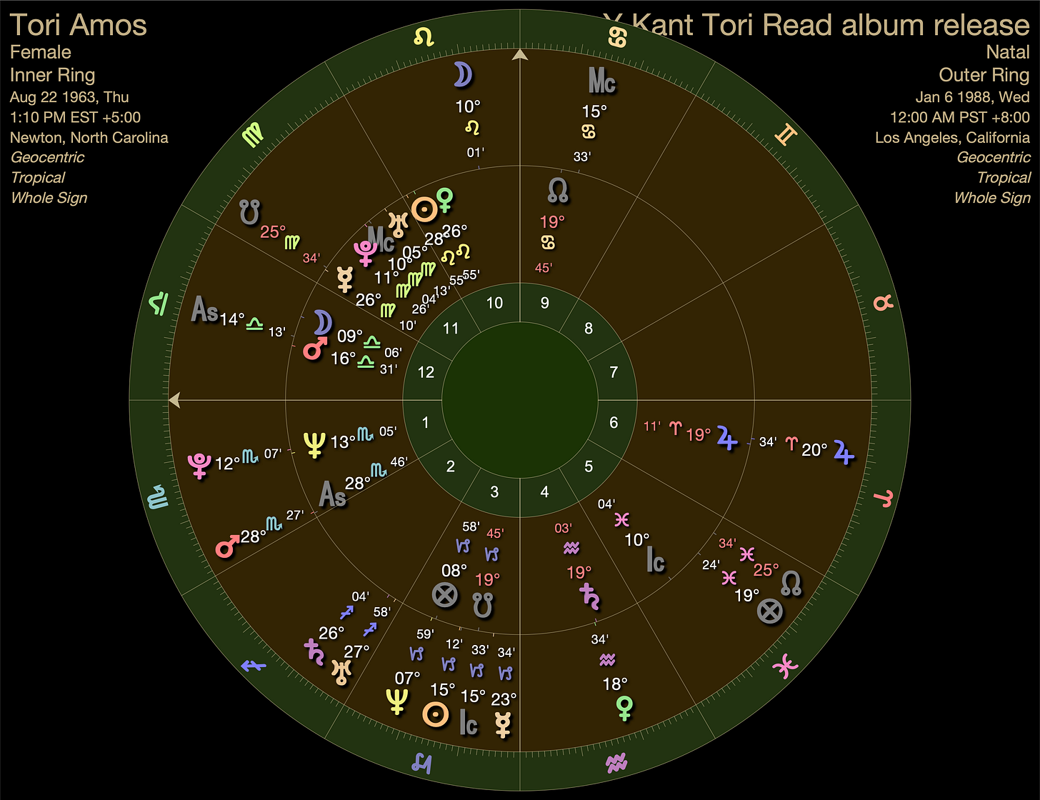 With her band, Y Kant Tori Read, Tori released her first album on January 6th, 1988. Transiting Mars was conjunct Amos’ Scorpio ascendant. Pluto, the planet of transmutation, was conjunct her natal Neptune, also in her first house. Neptune rules over our artistic vision, our self-mythology and perception.