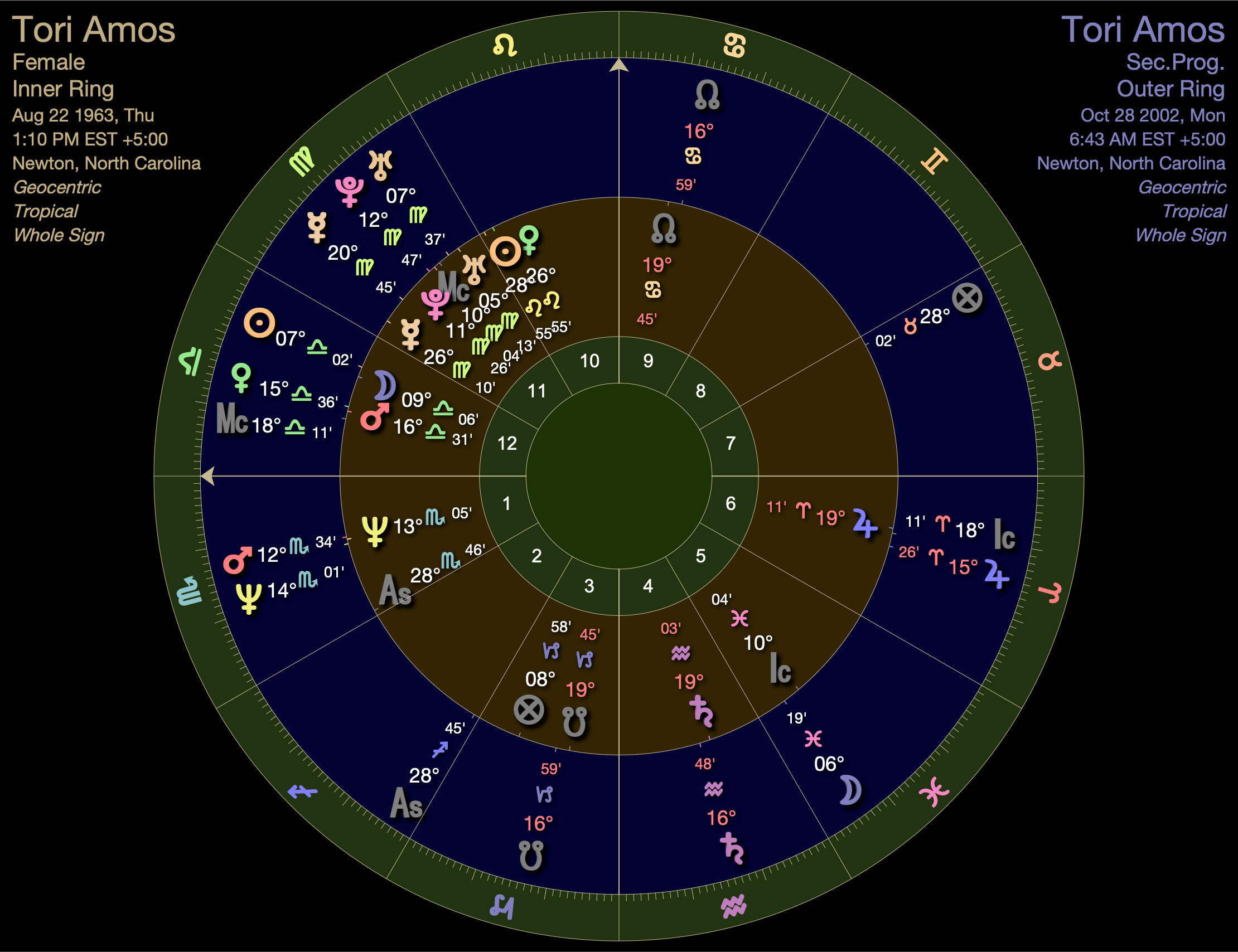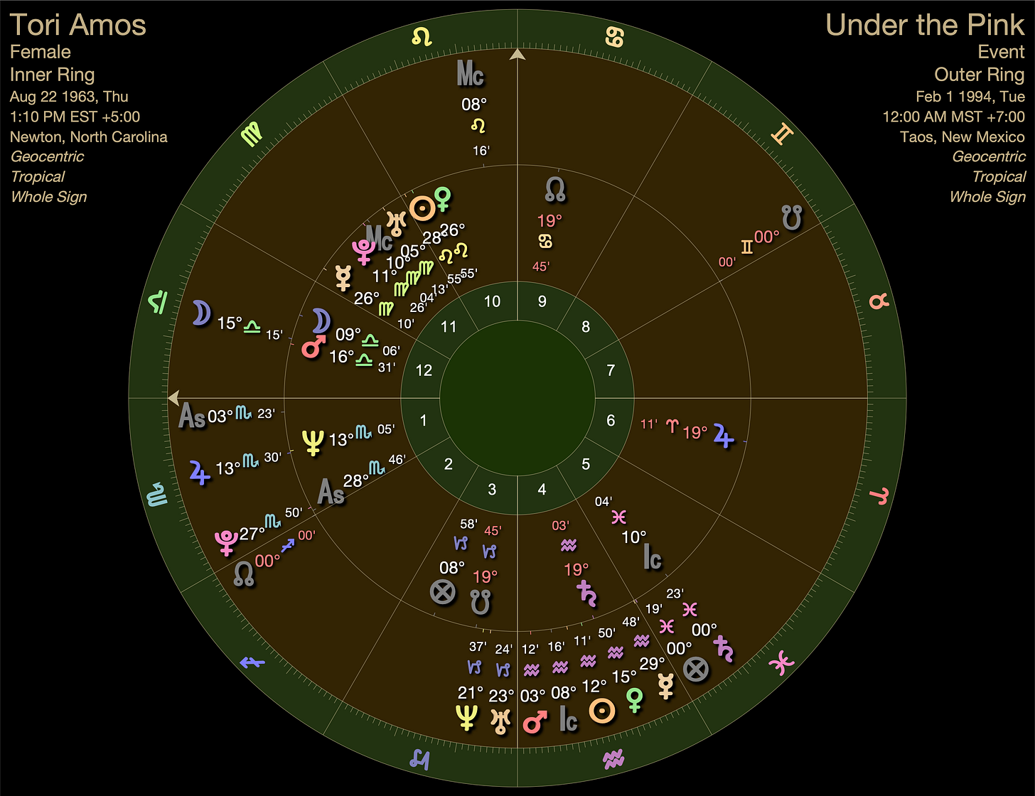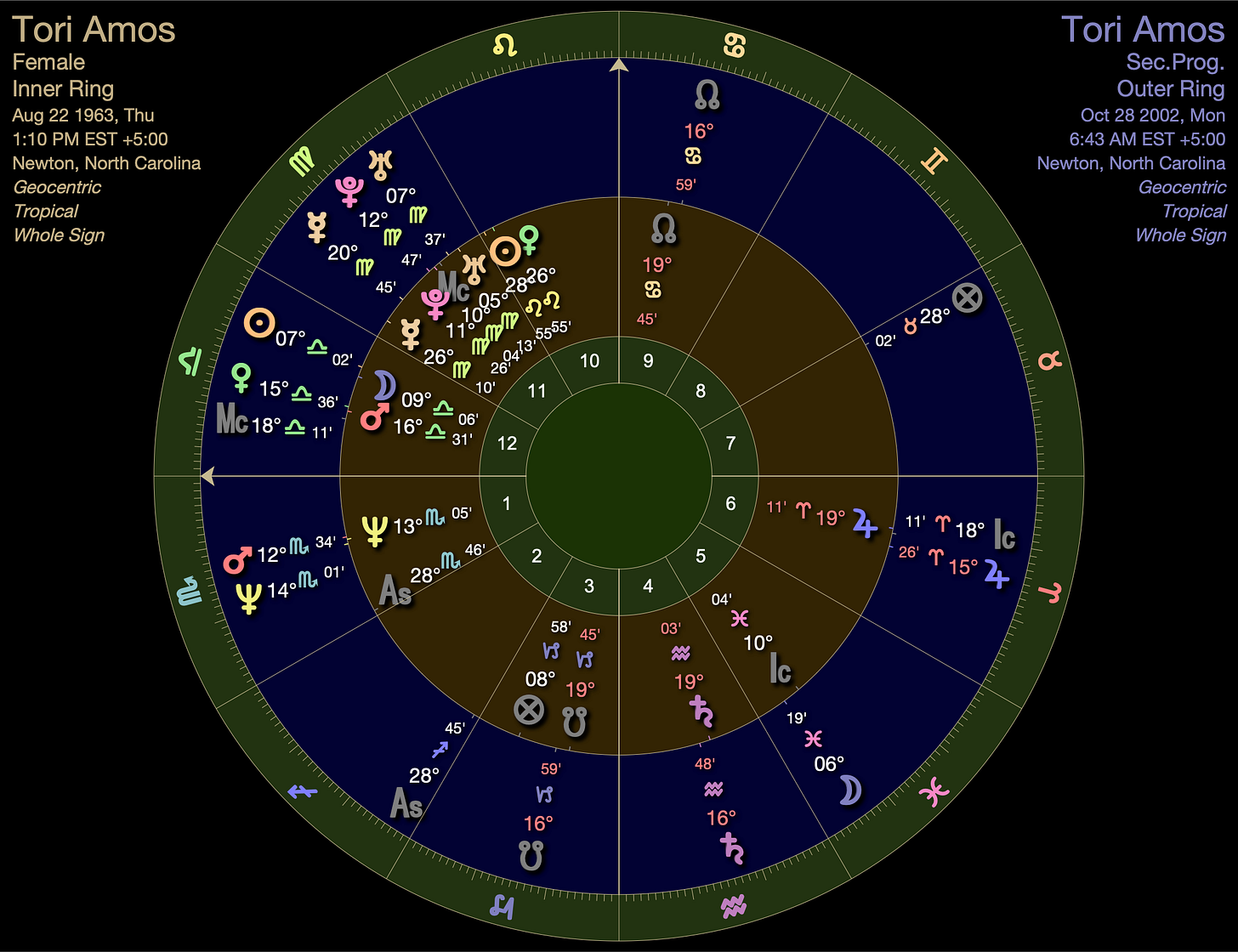 Tori was born with a late degree Scorpio ascendant. At two and a half when she started playing piano, her secondary progressed ascendant moved into Sagittarius where It would journey through Jupiterian realms for the next 39 years.