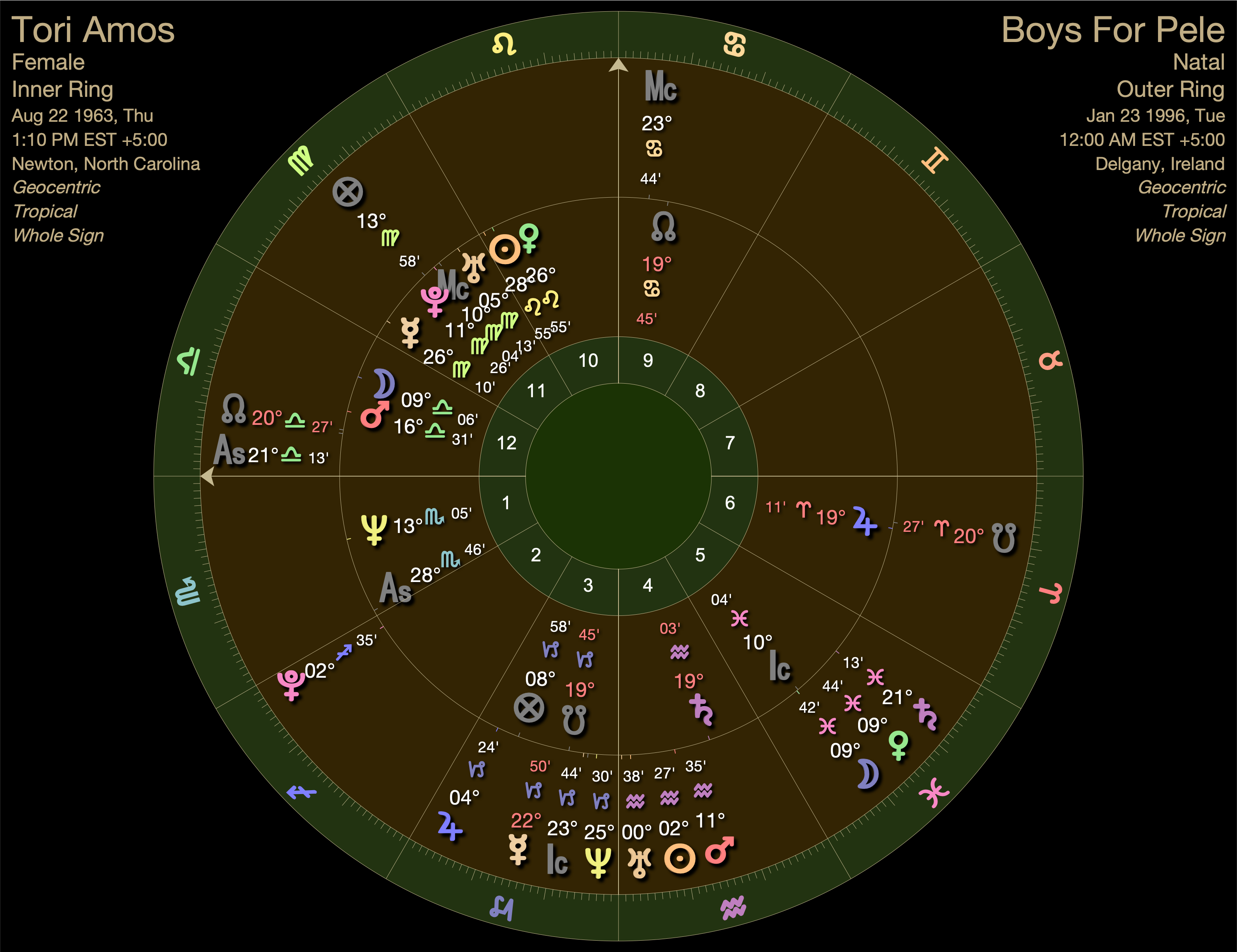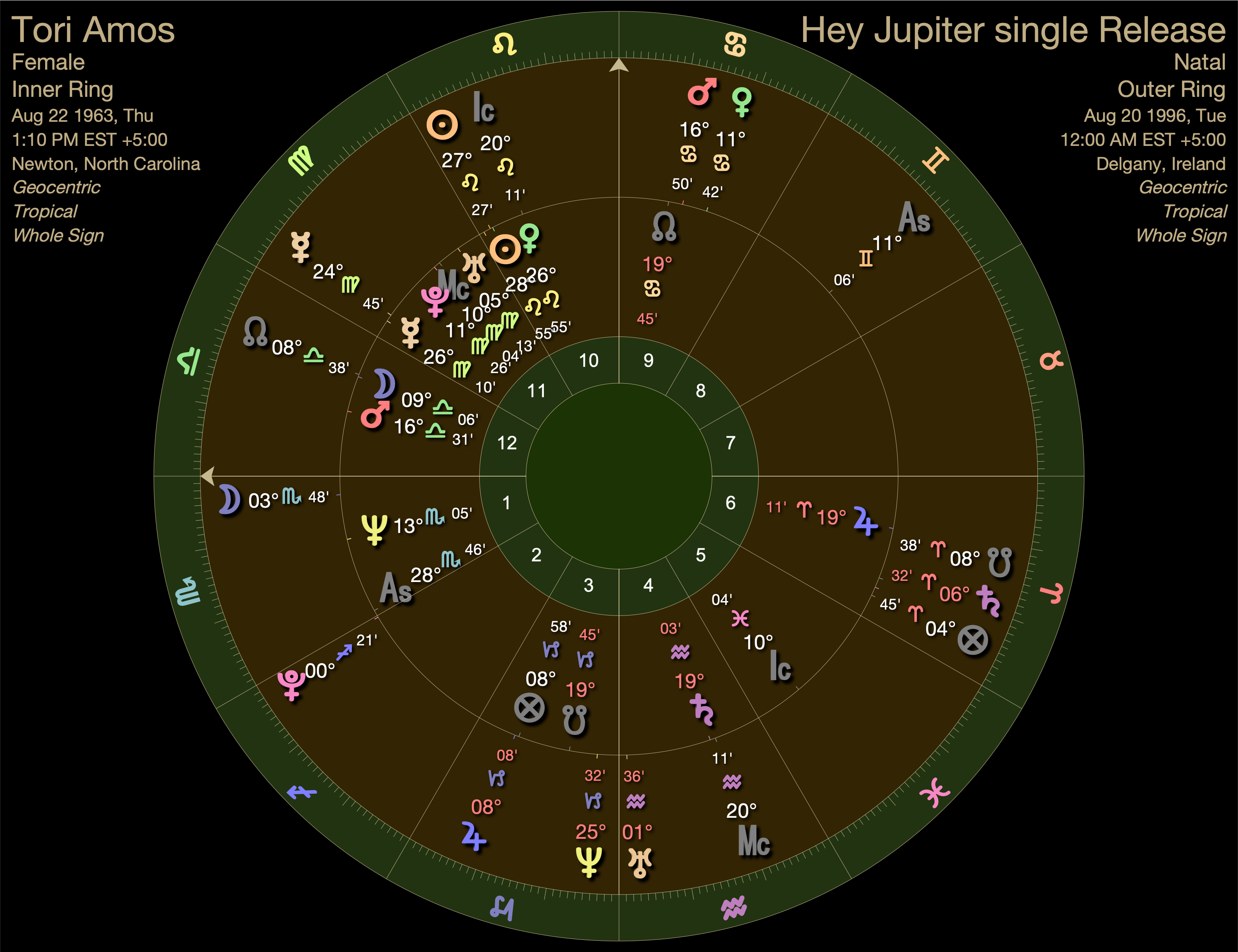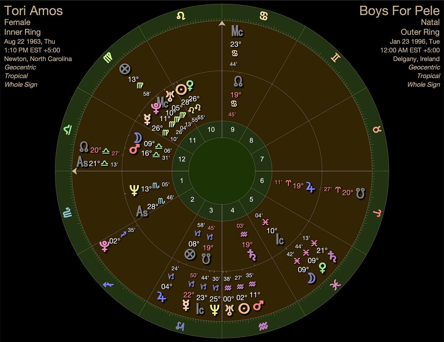 Tori was born with a late degree Scorpio ascendant. At two and a half when she started playing piano, her secondary progressed ascendant moved into Sagittarius where It would journey through Jupiterian realms for the next 39 years.