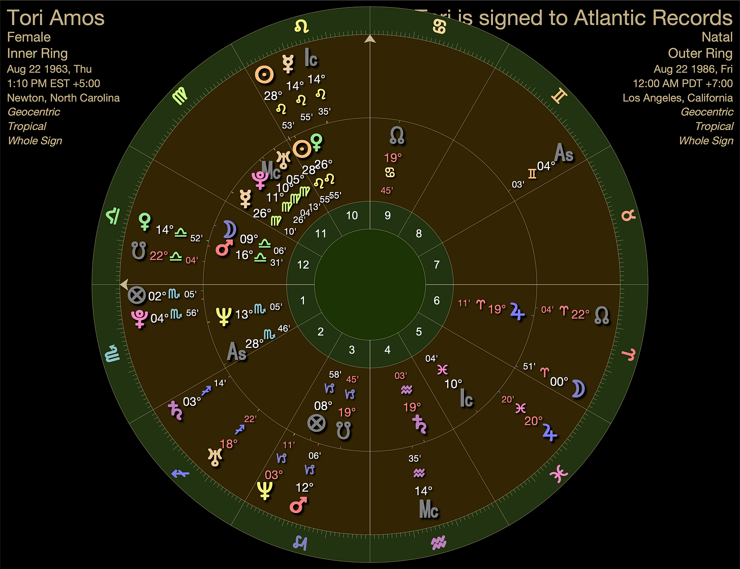 On Aug 22nd, 1986, Tori turned 23 years old and signed a record deal with Atlantic records. The north node of the moon, related to destiny, was conjunct her natal Jupiter in Aries.